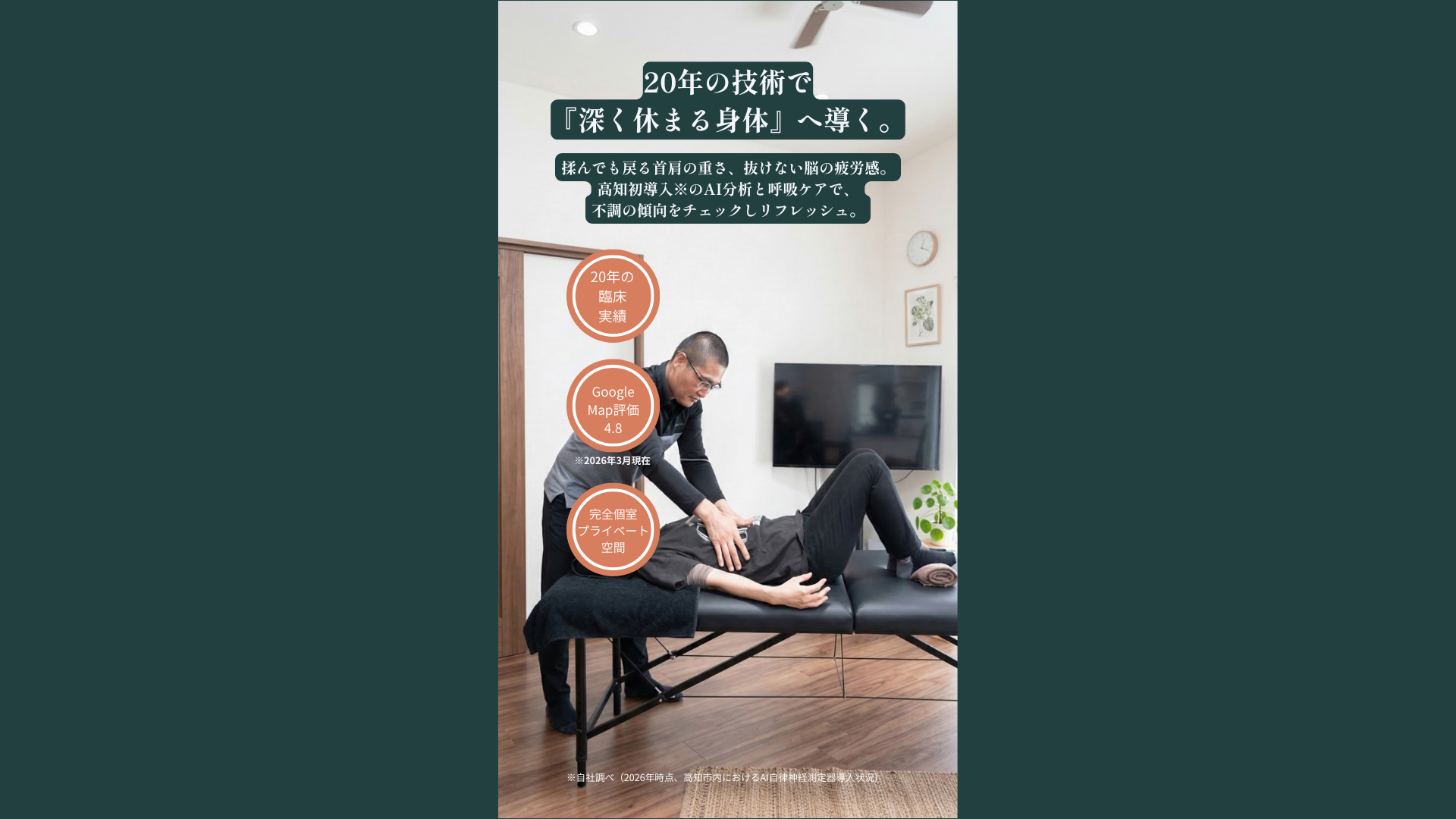 無理に耐えたり、通い続けたりする必要はありません。20年の実績とAI分析が、あなたの身体の「休まり方」を最短距離でサポートします。まずは一度、ご自身の今のバランスを可視化してみませんか?あなたの毎日に、深い呼吸と心地よい目覚めを。
